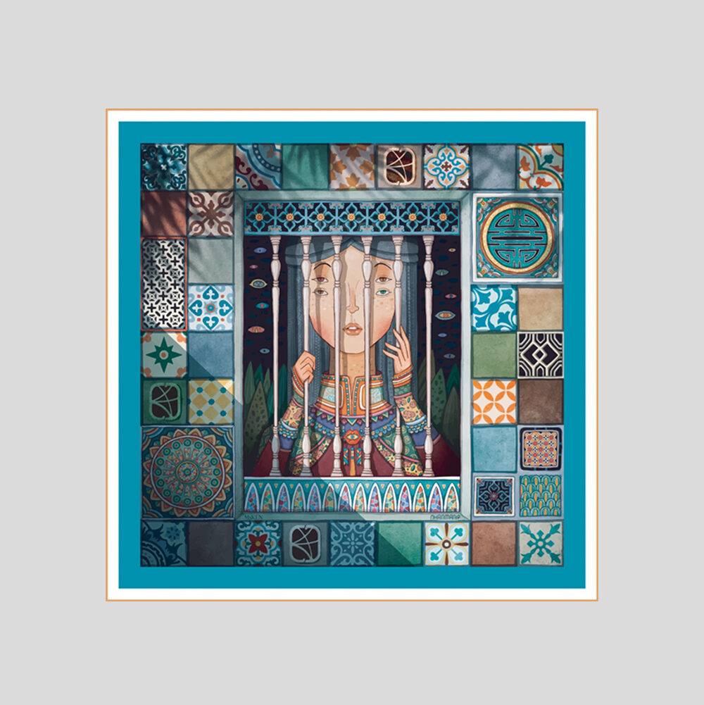 The young girl depicted on the scarf represents the aspirations and dreams of Vietnamese women who desire to break free from traditional gender roles and expectations. She is shown imprisoned in a house, surrounded by peering eyes that represent societal scrutiny and judgment.