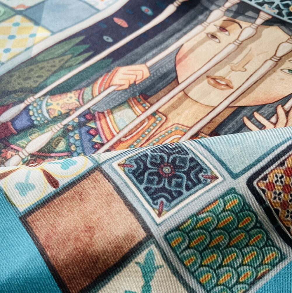 The “Hope” silk scarf symbolizes the longing for liberation from these societal constraints.